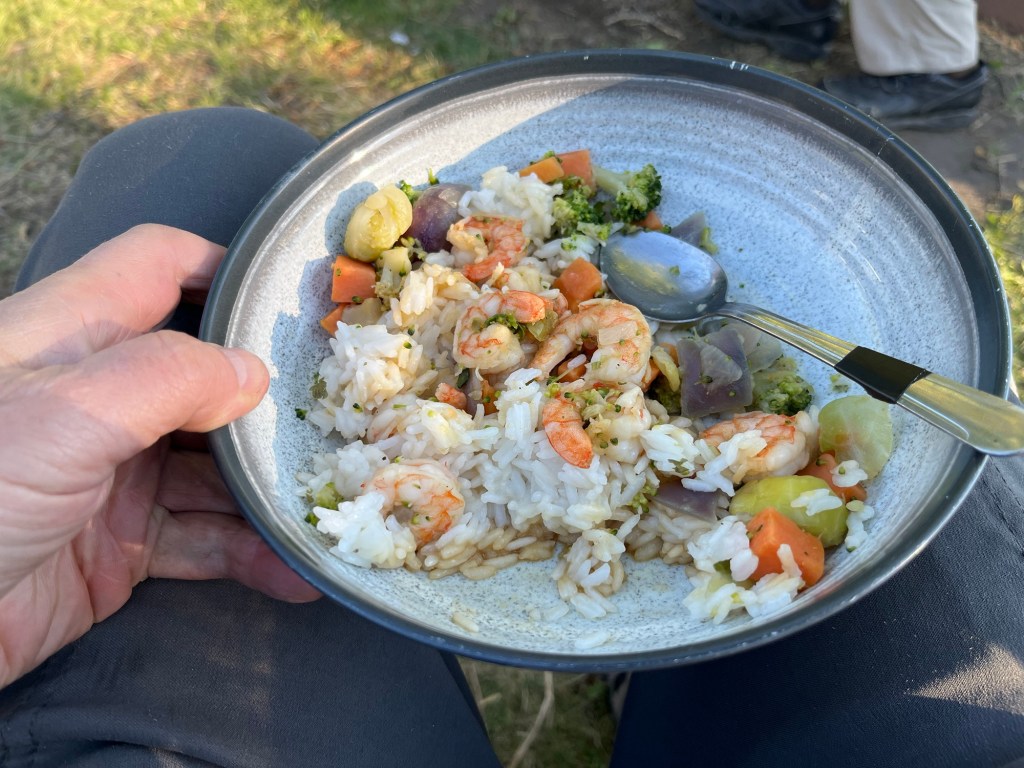 Dinner was another treat with mixed vegetables and shrimp with rice. Yum! This may sound a bit indulgent mentioning the meals along these travels, but given the work we do paddling and the time spent on the river, there’s nothing quite like a great dinner to cap off the day.