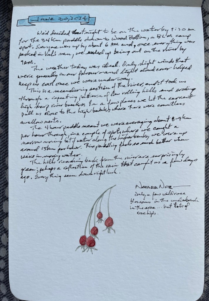 The current was moving well as we paddled past cliffs where even the tiniest overhang was filled with mud-made swallow nests. In a few places, as we passed, a cloud of swallows dropped from their nests to sweep out over the river looking for a snack of mosquitoes. Pleasantly, I have to say that there were very few mosquitoes on this trip!