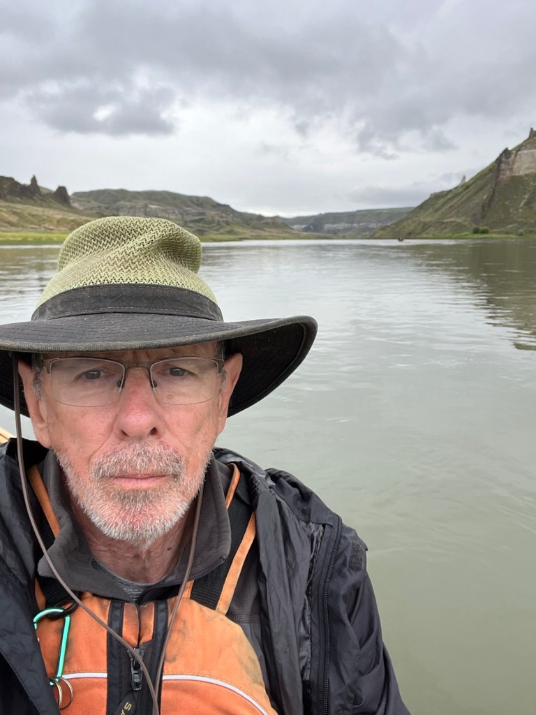 Since Fort Benton, we’ve met a young man (John) a few times as he canoes the river. He and his dog (Eddie) were at Slaughter River too, and we spent some time chatting about all things canoeing and his experiences traveling solo in this back country. Seems he’s been travelling this and other rivers for some time and working from time-to-time to finance the next leg of his journey. Tall, well spoken, Masters Degree in Wildlife Biology, physically strong, and with lots of thoughtful insights, he was a welcome addition to our old and familiar camp conversation. As evening rolled around, he made his way back to the riverbank and shunted his way into the current to a campsite further downstream.