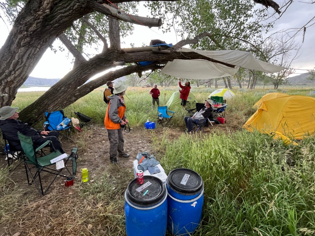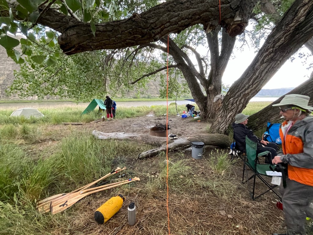 When we arrived in Gist Bottom, the wild thunder and lightening storm that had skirted us a bit as we sat on the riverbank had hit the campsite and Merle’s crew full on. Fortunately, I think most of them had pitched their tents before the deluge hit, and when we arrived their gear was ashore and they’d even set up a large tarp draped over some overhanging cottonwood branches for a bit of shelter for a few folding chairs and the cooking table.