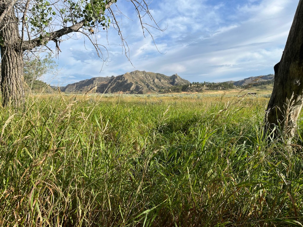 ‘Between the time of my A.M. and meridian observations, Captain Clark and myself strolled out to the top of the heights in the fork of these rivers from whence we had an extensive and most enchanting view: the country in every direction around us was one vast plain in which innumerable herds of buffalo were seen attended by their shepherds the wolves;’
